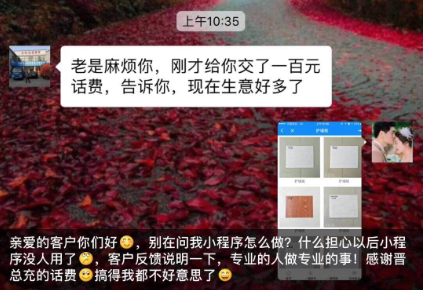 隨后中午10點30左右,一位合作客戶發來了微信,感謝海燕對公司的支持,現在生意好多了,并且給她充值了手機話費。海燕十分高興,并感謝晉總;